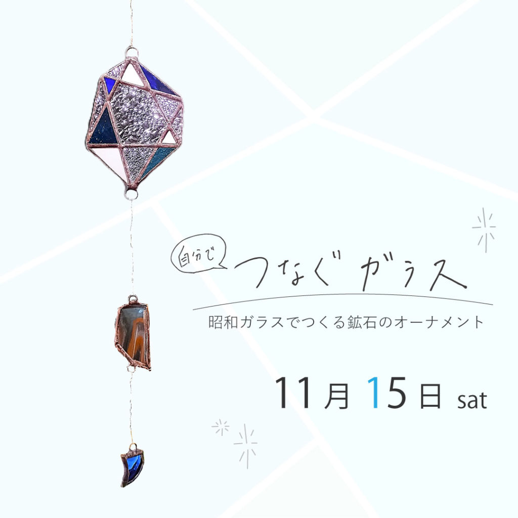 きらきらした昭和ガラスとブルーの色ガラスをはんだ付けでつなぎ合わせたトップに、ガラス瓶のかけらをつないでオーナメントに仕上げます。