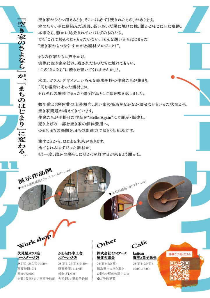 ある空き家から引き取らせていただいた素材を使って製作したガラスや木工などの作品を展示致します。