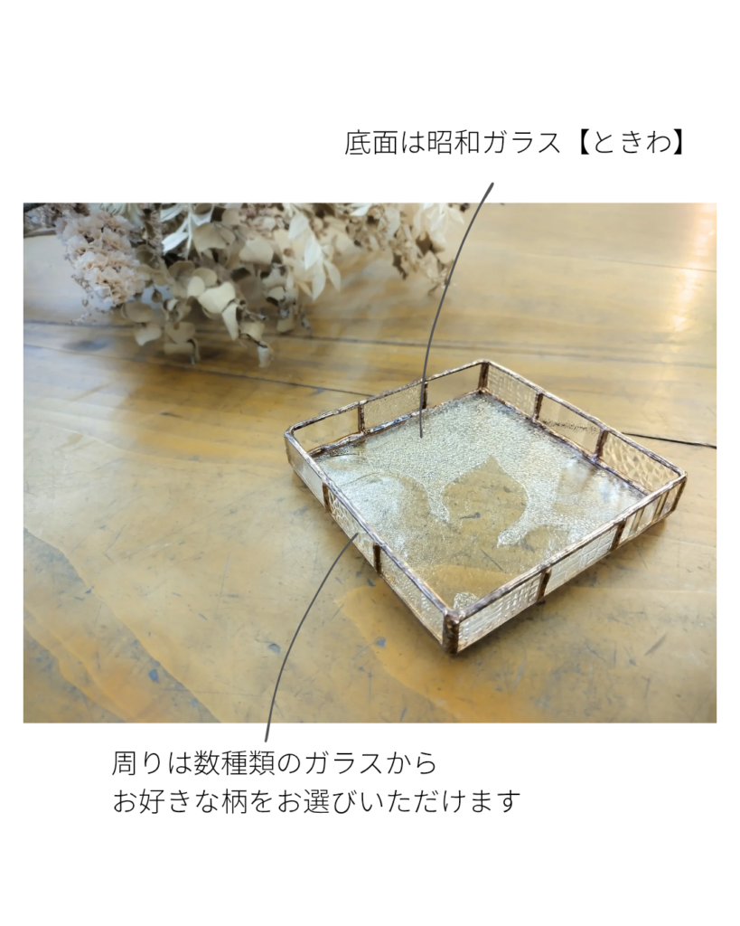 爽やかな葉っぱの模様の昭和ガラス【ときわ】をメインに、数種類の中からお好きな昭和ガラスを選んではんだ付けでつなぎ合わせ、トレーを完成させます。